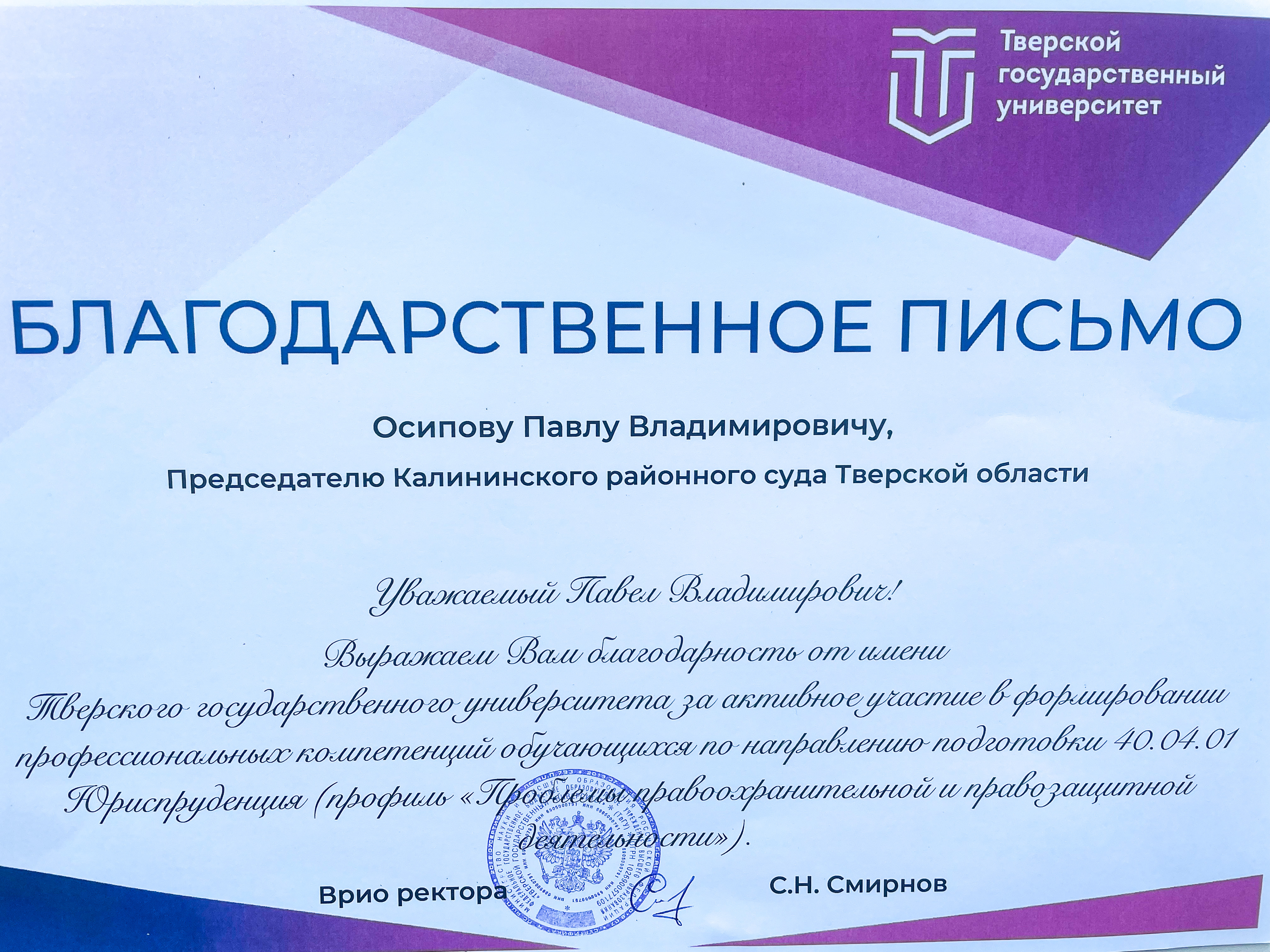 20 июня 2025 года на расширенном заседании учёного совета юридического факультета Тверского государственного университета деканом факультета Ильиной Ольгой Юрьевной председателю Калининского районного суда Тверской области Осипову Павлу Владимировичу вручено благодарственное письмо от врио ректора ТвГУ Смирнова С.Н. за активное участие в формировании профессиональных компетенций обучающихся по направлению подготовки «Юриспруденция» (профиль «Проблемы правоохранительной и правозащитной деятельности»). При публикации в СМИ ссылка на пресс-службу суда обязательна. Пресс-служба Калининского районного суда Тверской области тел. 8 (4822) 34-21-70